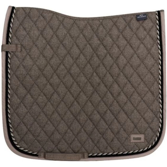Saddlepad made out of wool material with a binding of fake memory. With small diamond quilting, a velvet tape and a fancy twisted rope along the binding. With a luxury embroidery at the backline and small metal plate with brand logo at the corner.