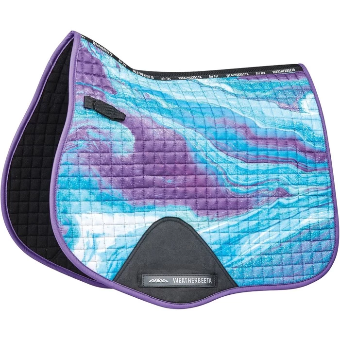 The WeatherBeeta Prime saddle pads offer high quality design and technology for your horses comfort. The WeatherBeeta Prime Marble All Purpose Saddle Pad is a durable cotton pad with a wick easy lining helping to keep your horse cool, dry and comfortable. The breathable mesh spine allows extra airflow to the horse’s back. The covered girth patch offers durability and the touch tape girth loops allow for a versatile fit. Easy attachment to the D-rings is made simple with short touch tape loops for a secure fit and the high wither design allows for extra space to assure maximum comfort for the horse. Gentle machine or hand wash at a low temperature, air dry, do not tumble dry. Matching range available.