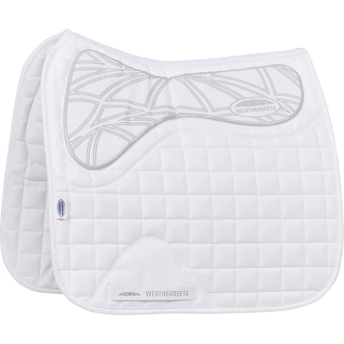 Sporty, stylish and practical design assists with the comfort of your horse and prevents slipping of the saddle. The WeatherBeeta Ultra Grip Dressage Saddle Pad features a silicone grip with memory foam padding situated under the saddle for ultimate comfort and practicality. The PCV girth guard reduces excessive wear for added durability, and the durable suede fabric with a wick easy lining helps keep your horse cool, dry and comfortable. Longer shape to sit perfectly with a dressage saddle.