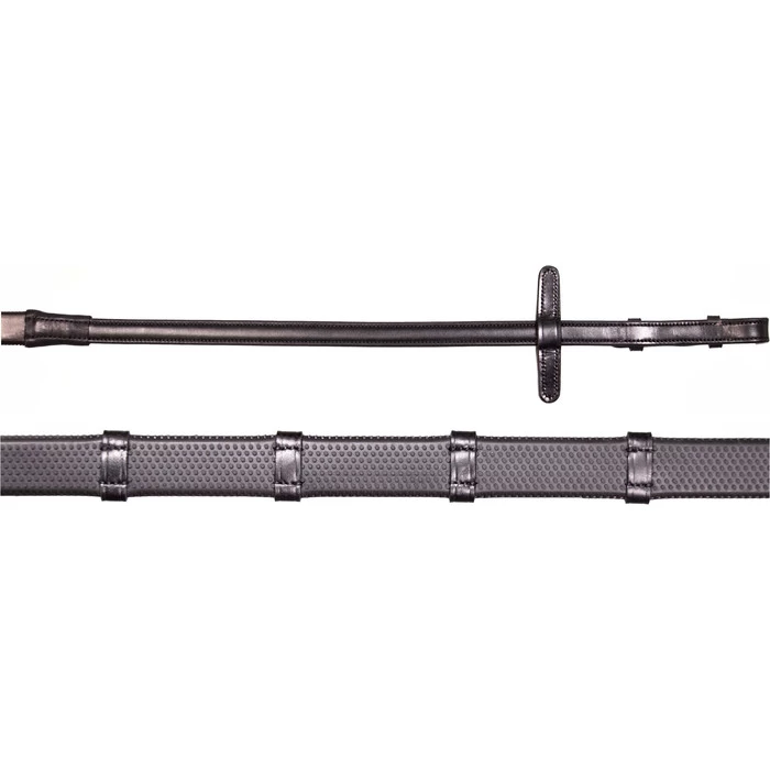 These reins feature small rubber pimples with hand stitched leather stoppers every 5cm. Very grippy with a slightly more coarse feel. Great for riders who prefer wearing gloves.